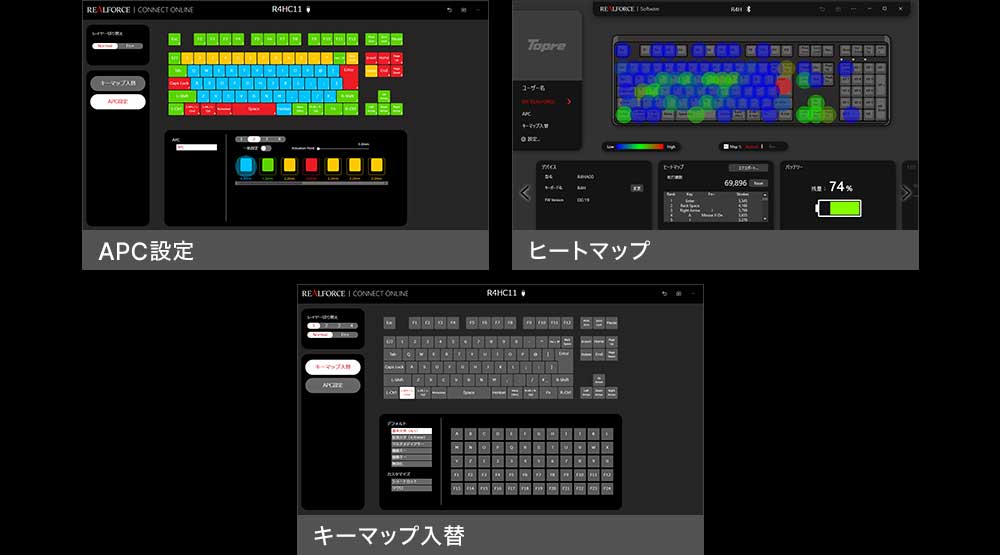専用のソフトウェアをインストールすることにより、APC 機能/ヒートマップ/キーマップ入替機能/キーマップ4面を切替/ECO モード設定/ファームウェアアップデート/オンボードメモリー機能などが利用可能です。
